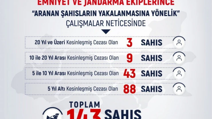 Elazığ Valiliği ekim ayında emniyet ve jandarma ekiplerinin yaptığı çalışmaları açıkladı. Yapılan çalışmalar neticesinde Elazığ’da toplamda 143 şahıs adli makamlara teslim edildi. Yakalanan şahıslardan 3’ünün 20 yıl üzeri, 9’unun 10 ile 20 yıl arası, 43’ünün 5 ile 10 yıl arası, 88’inin ise 5 yıl altı kesinleşmiş cezası bulunuyor.
