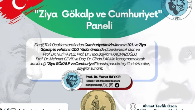 Elazığ Türk Ocağı, Cumhuriyetin 101. yılında Ziya Gökalp'ın vefatının 100. yıldönümünü anmak için 'Ziya Gökalp ve Cumhuriyet' konulu bir panel düzenleyecek.