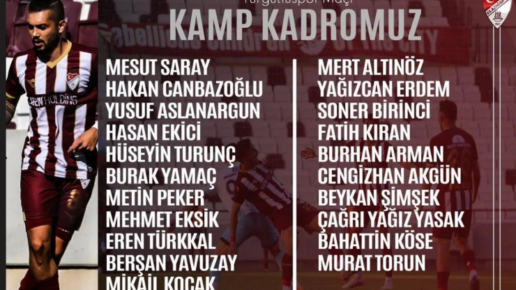 Bordo-Beyazlı Temsilcimiz 3Gen Holding Elazığspor 3. Lig 2. Grup’un 3. Haftasında deplasmanda Turgutluspor’la karşılaşacak. Zorlu maçın hazırlıklarını tamamlayıp Manisa’ya giden Bordo-Beyazlı ekibimizde hedef sezonun ilk galibiyetini almak. Teknik Direktör Selahaddin Dinçel’in takdiriyle kadroda; Mesut Saray, Hakan Canbazoğlu, Yusuf Aslanargun, Hasan Ekici, Hüseyin Turunç, Burak Yamaç, Metin Peker, Mehmet Eksik, Eren Türkkal, Berşan Yavuzay, Mikail Koçak, Mert Altınöz, Yağızcan Erdem, Soner Birinci, Fatih Kıran, Burhan Arman, Cengizhan Akgün, Beykan Şimşek, Çağrı Yağız Yasak, Bahattin Köse ve Murat Torun olmak üzere toplam 21 futbolcu yer aldı.