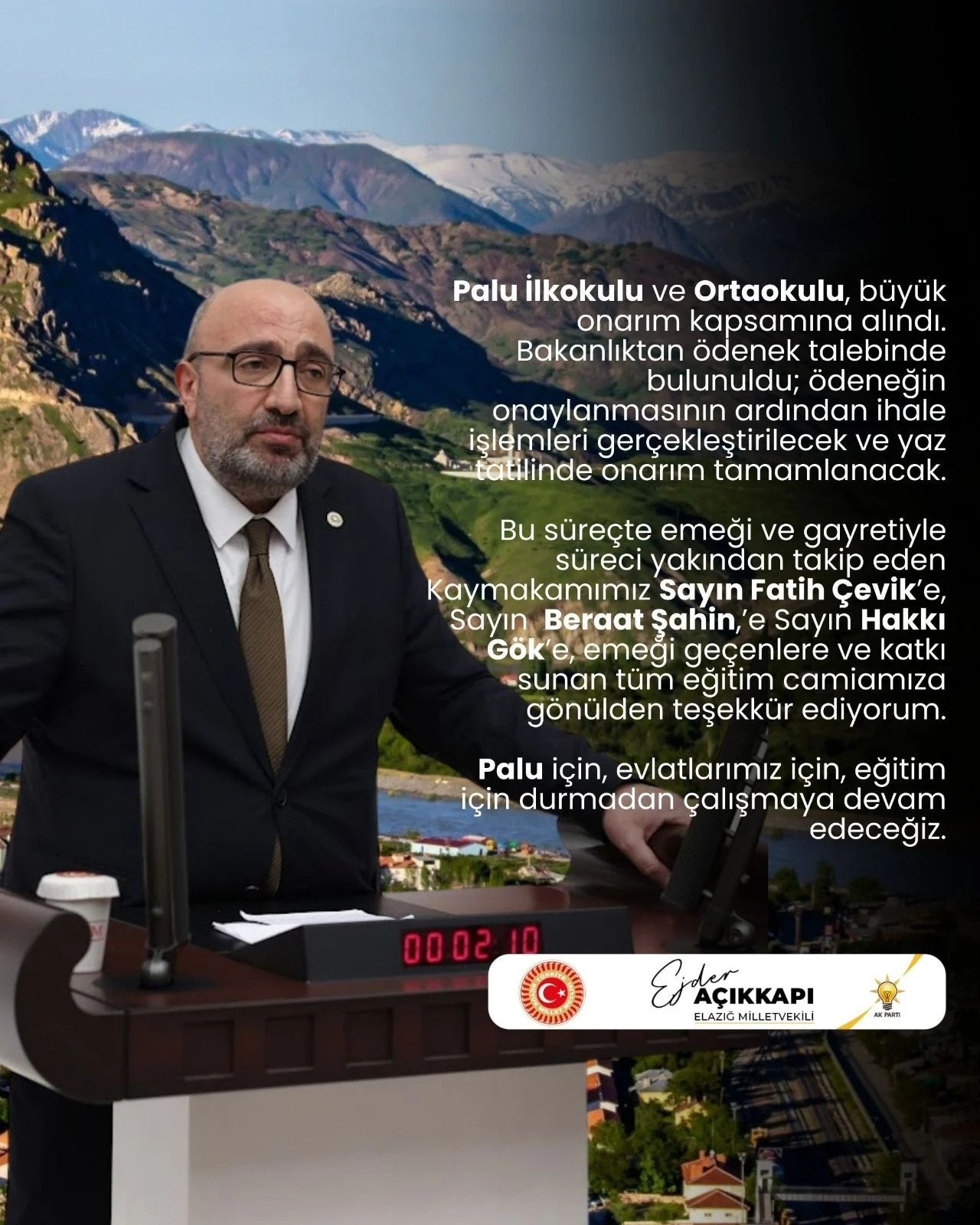 AK Parti Elazığ Milletvekili Ejder Açıkkapı, Palu ilçesinde eğitim alanında hayata geçirilen ve devam eden yatırımlara ilişkin önemli açıklamalarda bulundu.